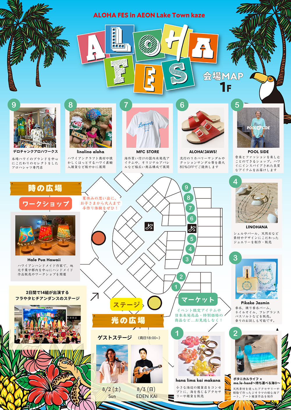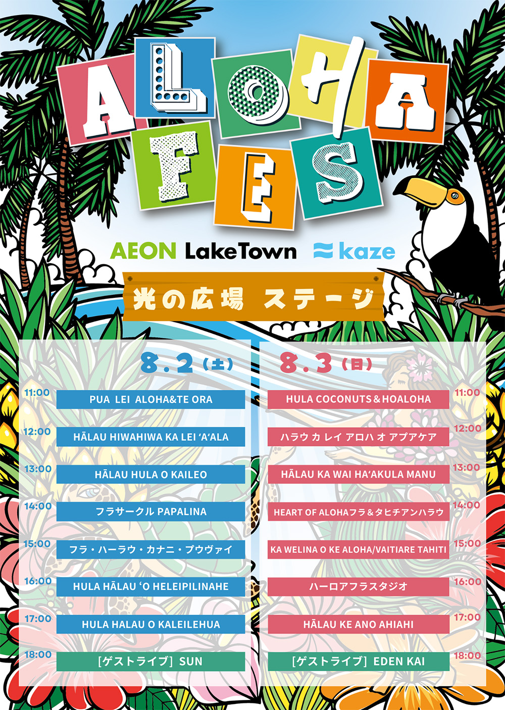 昨年も大好評だった「ALOHA FES in AEON Lake Town kaze」の開催が決定しました!フラ&タヒチアンダンスショーやSNSでも話題のミュージシャンによるライブが無料で楽しめるほか、ハワイアンワークショップも開催!